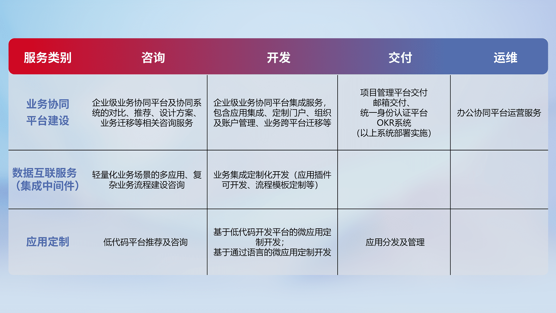针对钉钉、、企微、、、、IDaas等平台级产品提供产品的规划、、、方案、、交付、、、、定制化开发等服务,,,实现如统一协同办公、、、、智能客户服务、、、、混合会议管理、、智能数据查询、、、、等业务场景,,,实现数字化转型。。。