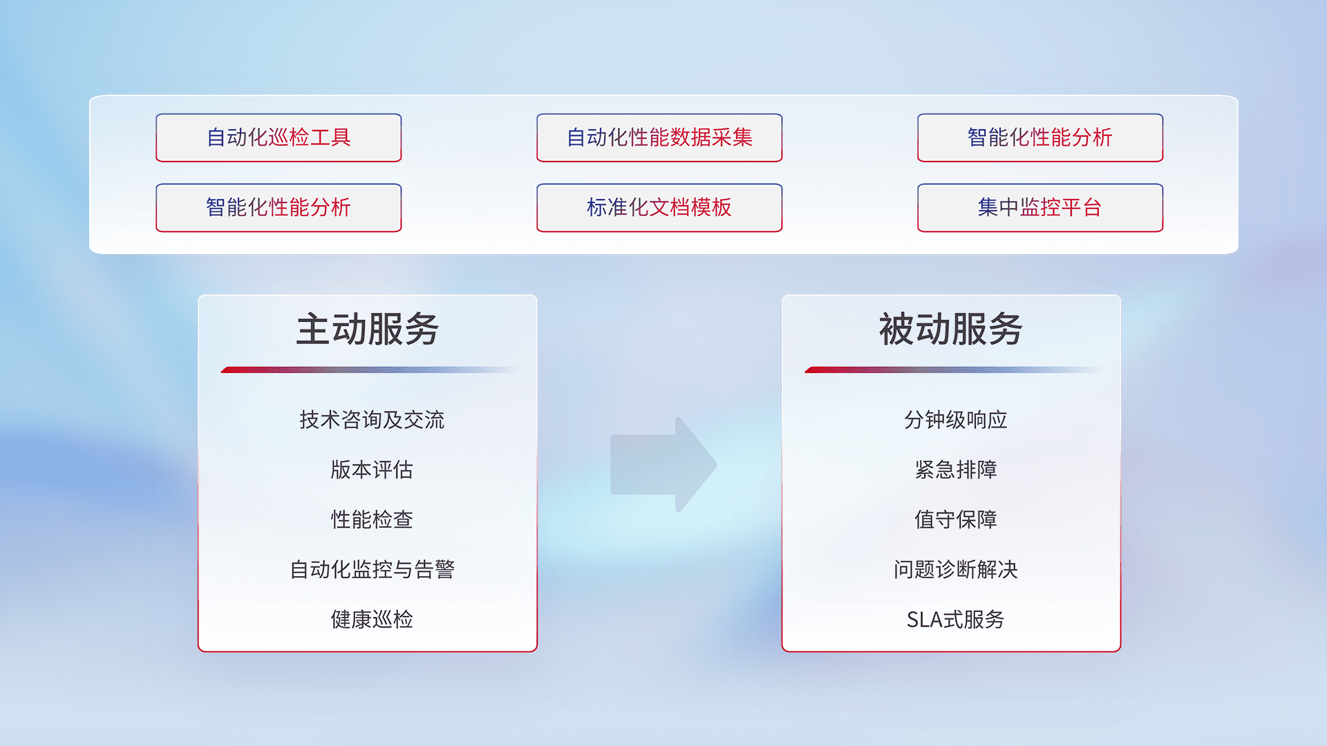 智能化工具和标准化文档,,,,保障服务质量,,,提供主动服务(包含技术咨询、、、版本评估、、、、性能检查、、自动化监控与告警、、、、健康巡检)和被动服务包含(分钟级响应、、、紧急排障、、、值守保障、、、、问题诊断解决、、、SLA服务)。。